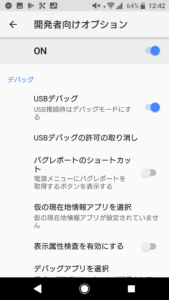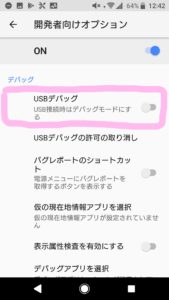 下の方へスワイプしていくとUSBデバックの項目があるので、そこのスイッチをタッチしてONにしましょう。これにより自身のスマートフォンでデバック作業ができるようになります。